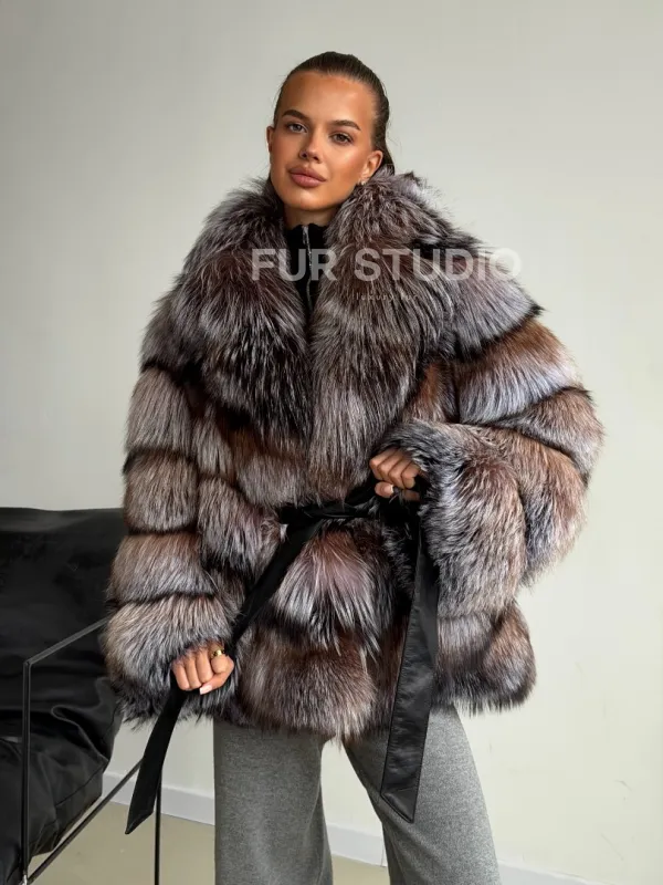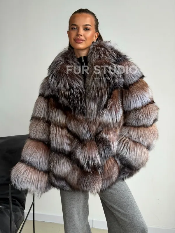 Мех данной шубы лиса, цвет серый. Предлагается в размерах от 42 до 50. Длина модели 65-70 см, что выгодно подчеркивает фигуру девушек. Эта модель идеально подойдет для девушек и женщин, предпочитающих роскошные натуральные меха.